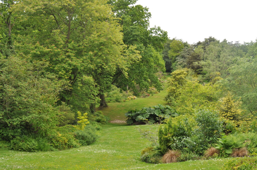 Au-delà des chambres de verdures plus strictes qui entourent la maison, Jean-Louis Dantec compose un tableau paysager tout en courbes, une grande coulée verte bordée d’arbres et arbustes rares qui conduit le regard en contrebas vers les étangs bordés de gunneras, taxodiums et d’érables japonais. Les grands arbres, des hêtres notamment sont repoussés à la lisère pour servir d’écrin aux plantations. Le jardin compte une importante collection de végétaux mais le jardinier a su trouver un bon équilibre entre les pleins et les vides en ouvrant des échappées vers le ciel et en taillant en transparence.
