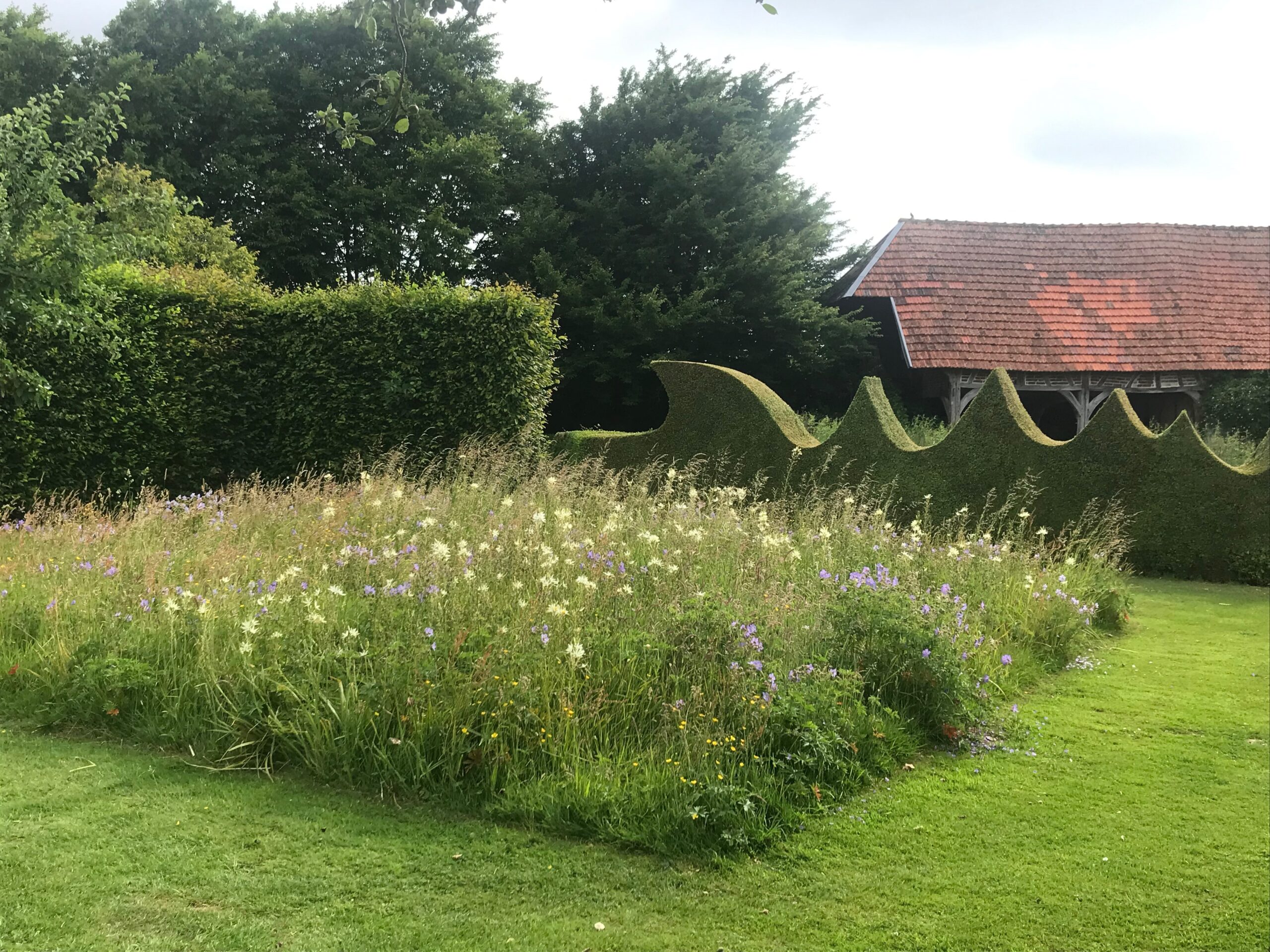 Pour le structurer, des axes ont été tracés est-ouest et nord-sud autour desquels s’organisent en damiers de larges chemins tondus. Un grand et simple bassin miroir carré, sans plantes, posé à fleur de pelouse a été creusé dans l’axe central. Les « carrés » non tondus issus du dessin ont conservé leur végétation indigène faite de boutons d’or, de trèfles roses et blanc, de petite oseille, de graminées. Puis afin d’augmenter cette diversité, ont été plantés des bulbes de camassias, de narcisses, de perce-neiges, d’ails d’ornement, de fritillaires… puis a commencé un programme de réimplantation de plantes indigènes poussant au bord des routes : succises des prés (Succisa pratensis), sauges (Salvia pratensis), bétoines (Stachys offinalis), primevères (Primula verris), compagnons roses et blancs, campanules (Campanula rapunculus), géranium des prés (Geranium pratense), rhinanthes (Rhinanthus alectotolophus). Ces carrés sont fauchés une fois l’an vers la mi-octobre, débarrassés de leurs chaumes et débris et tondus très ras avant l’hiver.