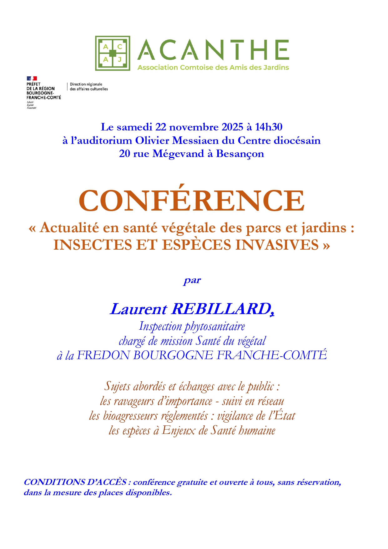 conférence le samedi 22 novembre 2025 « Actualité en santé végétale des parcs et jardins : INSECTES ET ESPÈCES INVASIVES » par Laurent Rebillard, chargé de mission à la FREDON Bourgogne-Franche-Comté