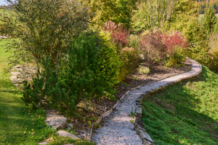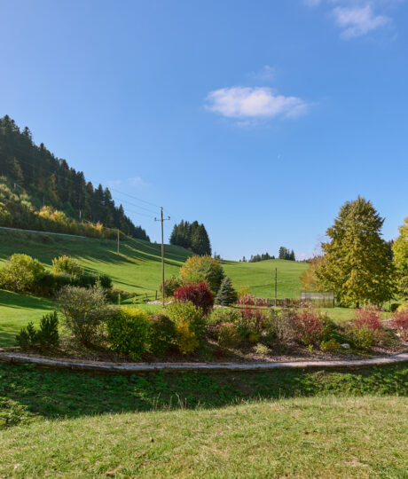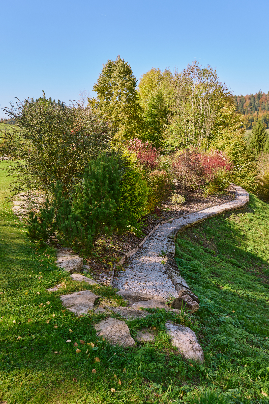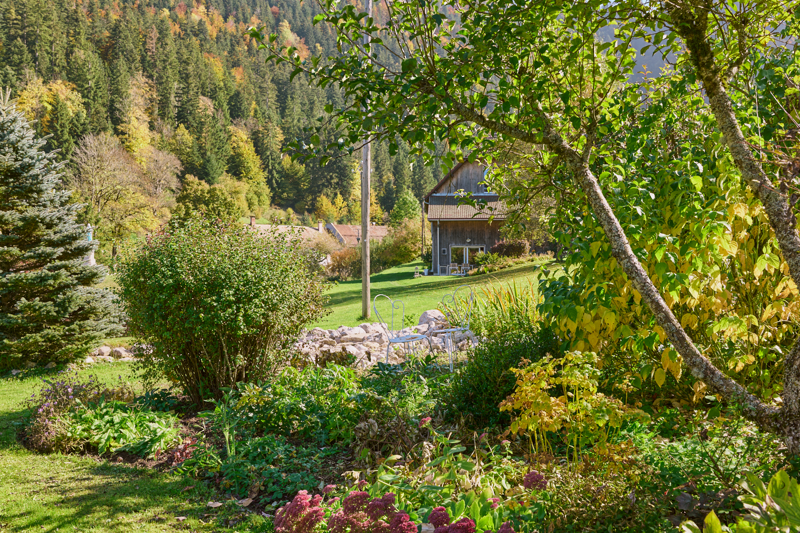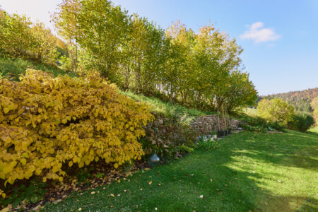 La visite se termine par une seconde rocaille qui se découvre en empruntant une allée en belvédère tournée d’un côté sur le vallon et de l’autre sur les plantations. Cette rocaille compte des arbres d’ornement (catalpa, amélanchier…) et différents arbustes (physocarpus doré, arbre à perruque, chèvrefeuille arbustif). Le retour à la maison offre, grâce à la terrasse fleurie et au mur de pierres sèches agencé pour accueillir des plantes sensibles au gel, deux lieux de détente appréciables. Le jardin déborde de son parcellaire, intégrant pleinement un environnement remarquable : falaises de la reculée, paysage du Haut-Doubs (forêt jardinée, ruisseaux, etc.), église, et moraine avec son oratoire. Sans limite, il s’approprie l’espace dans un panorama à 360°.