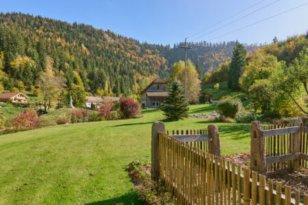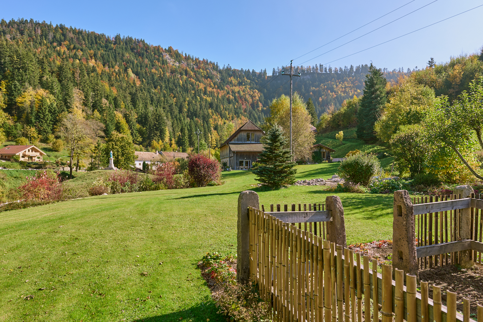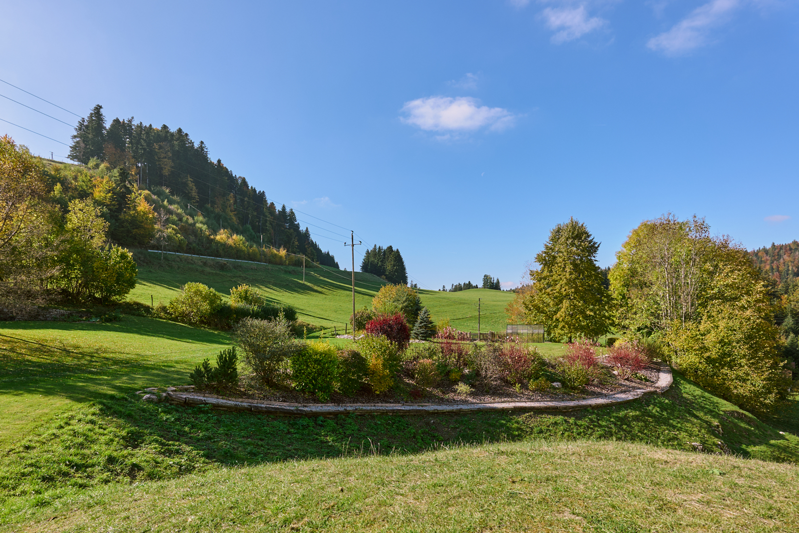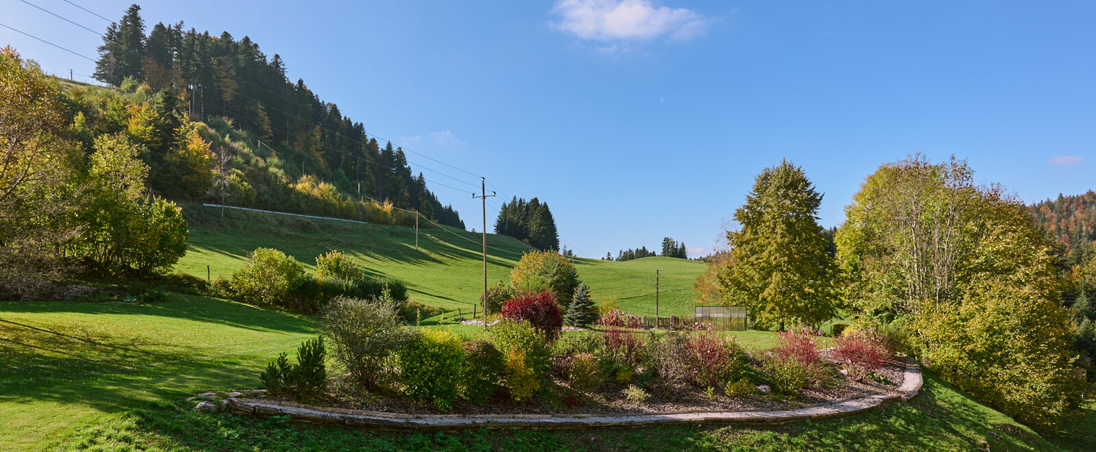 La visite se termine par une seconde rocaille qui se découvre en empruntant une allée en belvédère tournée d’un côté sur le vallon et de l’autre sur les plantations. Cette rocaille compte des arbres d’ornement (catalpa, amélanchier…) et différents arbustes (physocarpus doré, arbre à perruque, chèvrefeuille arbustif). Le retour à la maison offre, grâce à la terrasse fleurie et au mur de pierres sèches agencé pour accueillir des plantes sensibles au gel, deux lieux de détente appréciables. Le jardin déborde de son parcellaire, intégrant pleinement un environnement remarquable : falaises de la reculée, paysage du Haut-Doubs (forêt jardinée, ruisseaux, etc.), église, et moraine avec son oratoire. Sans limite, il s’approprie l’espace dans un panorama à 360°.